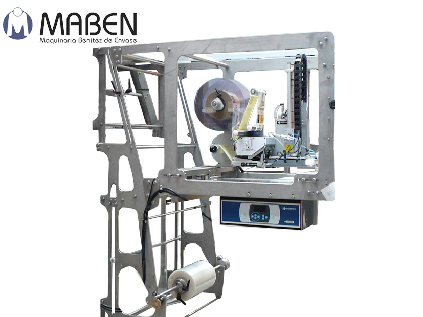 Codificación de etiquetadora/impresora de alta velocidad. Su ancho máximo de etiquetas impresas, dependerá de las necesidades del cliente. Integrada en envasadora con soporte carro bobina Maben, especialmente diseñado y personalizado para este complemento.