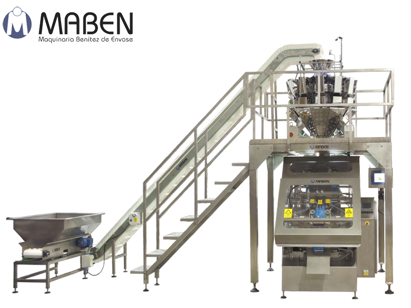 Envasadora vertical multiformato, inclinada a 45º, diseñada para envasar en grandes formatos (oscilan entre 7,5 cm y 33 cm de ancho) de productos delicados. Formadora de bolsas tipo almohada, stabylo, plegado inglés con plegado de fondo. Su velocidad dependerá siempre del producto a envasar, gramaje y el formato que se elija. Pantalla táctil, con software programable hasta más de 100 recetas. Posibilidad de doble largo de bolsa.